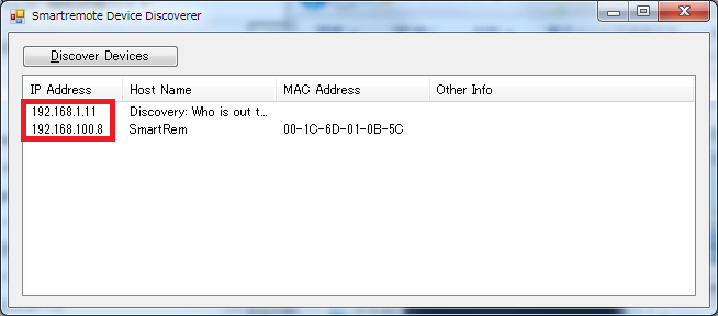 Discovery....と表示されている行とSmartRemと表示されている行に示されているIPアドレスをチェックします。