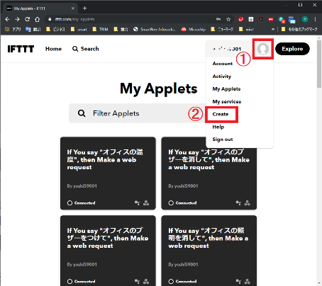 1.IFTTTにSign in(ログインした状態)後に人型のアイコン@をクリック