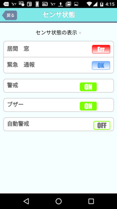 センサ状態画面ではセンサの状態確認と警戒の開始/停止を操作します。