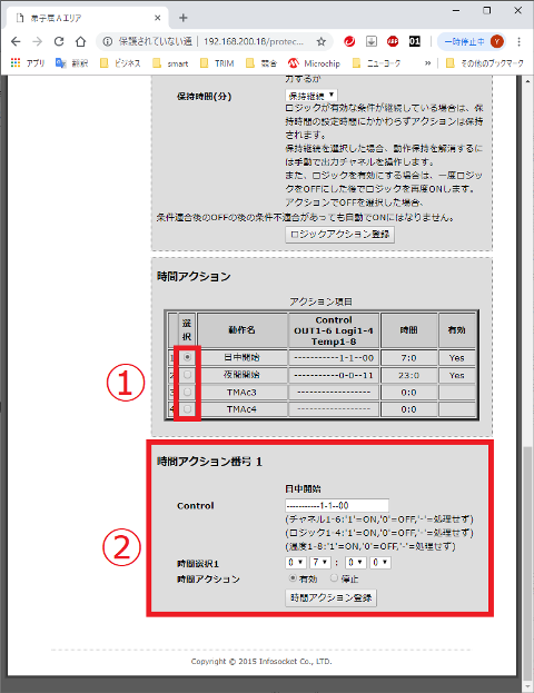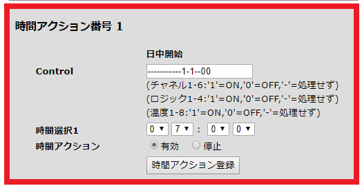 | 設定を変更した場合は、必ず[時間アクション登録]ボタンをクリックし、RESTARTして下さい。 |